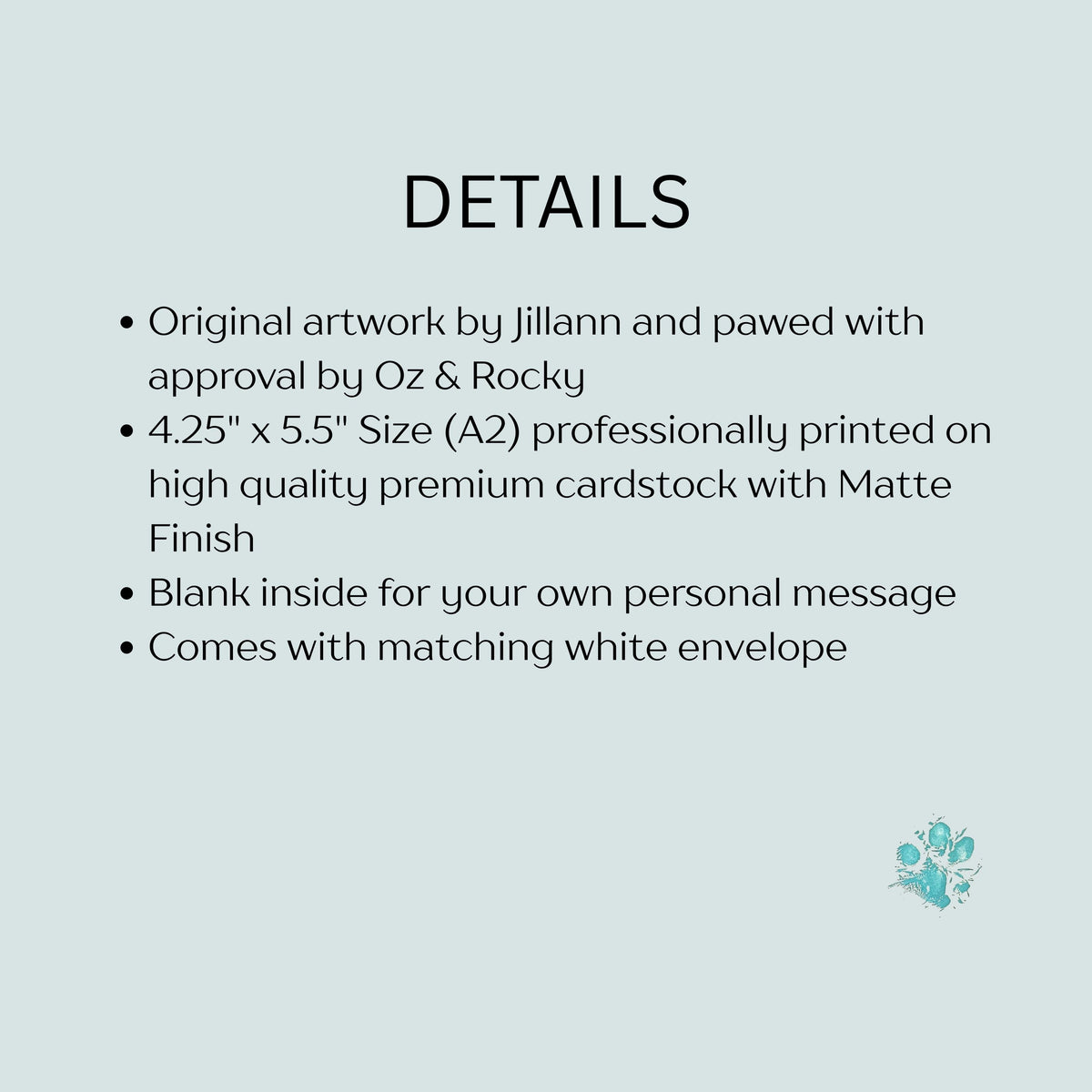 Printed in USA. Packaged by hand with a smile and pawed with approval by Oz and Rocky!
