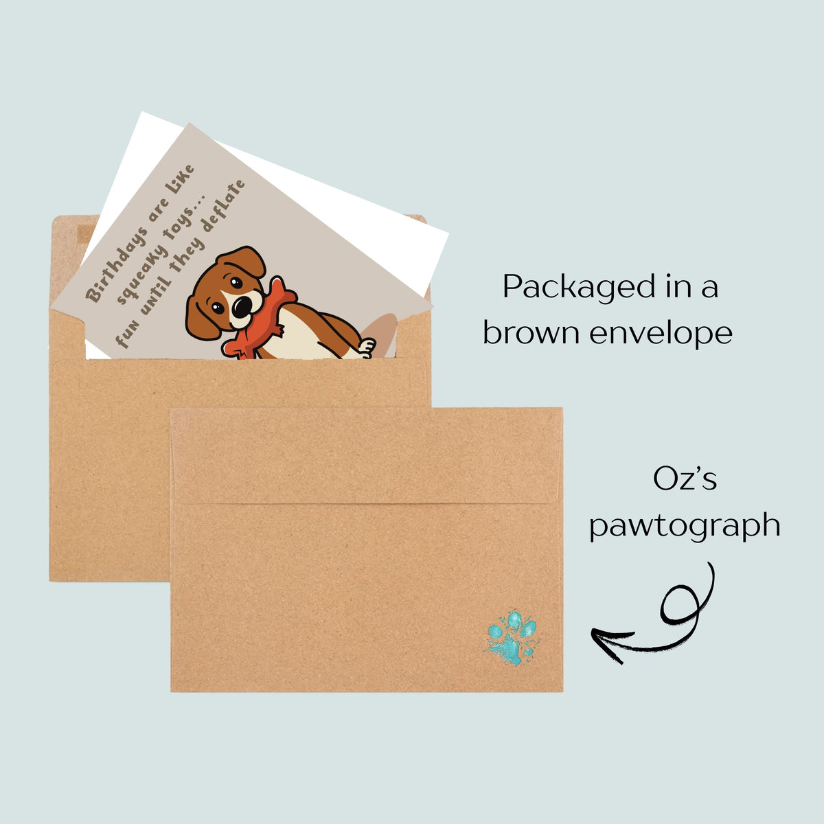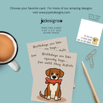 This funny greeting card features original hand-drawn artwork and is perfect for a pet lover's birthday. Measuring 4.25" x 5.5".  It is blank inside so you can personalize your message and includes a unique tagline on the back. Printed in the USA on high-quality cardstock and comes with a matching envelope.